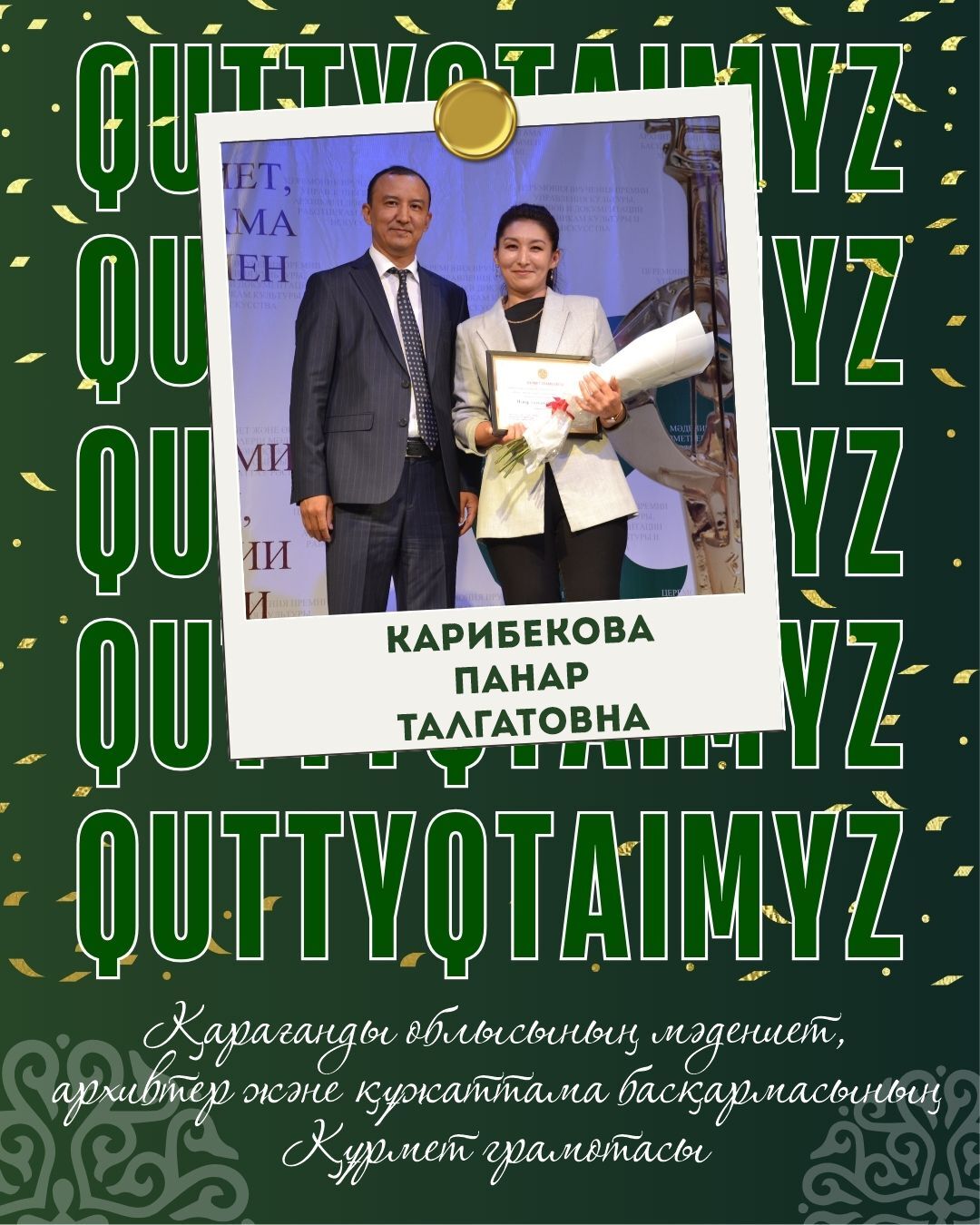 Тәттімбет атындағы академиялық қазақ аспаптар оркестрінің әртісі Карибекова Панар Талгатовна Қарағанды облысының мәдениет, архивтер және құжаттама басқармасының «Құрмет» грамотасымен марапатталды.